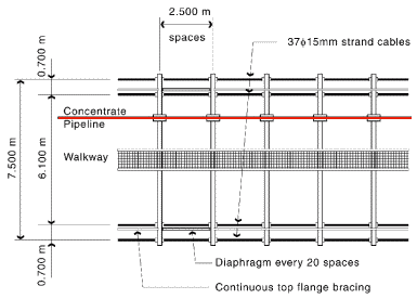 The structural components of the bridge include two pairs of cables, anchored in reinforced concrete abutments, that support the ends of 8 m long floor beams. These beams in turn support the pipe and stringers for the foot path. As the unbraced steel grillage does not stiffen the bridge, all vertical and lateral loads are resisted by the cable system.