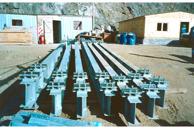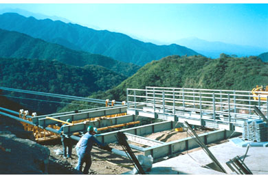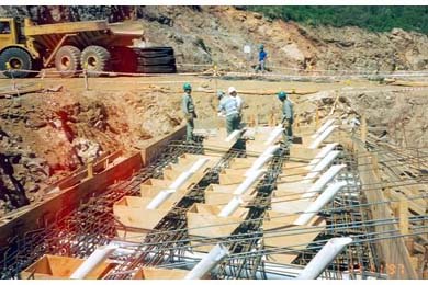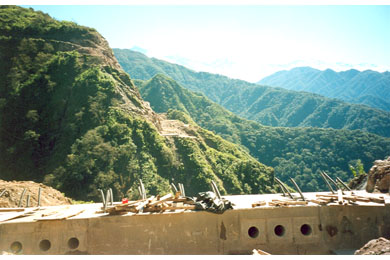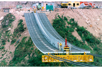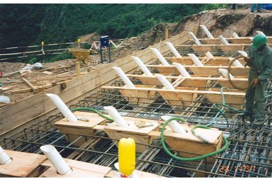 Construction of the abutments began in September 1997. Installation of the rock anchors was completed in July 1998 after several months of delays due to bad weather and the need to stabilize and clear the slopes of loose rock.