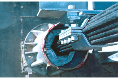 The anchorage deviator on each cable consists of a neoprene insert in the anchorage duct. It performs three essential functions. First, it confines the individual strands into a parallel bundle as the cable enters the anchorage assembly. Second, it permits an angle break of ± 4.1°. Third, it alleviates fatigue stresses on the anchor head and at the strand anchor wedges.