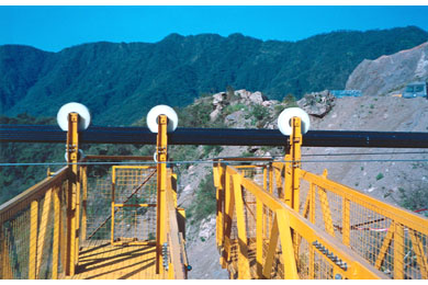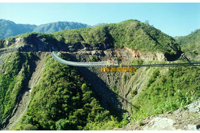 The 337 m single span bridge carries a 1 m wide foot path and 0.2 m diameter pipe across a rugged 90 m deep valley. It is an unstiffened suspension structure, with cables that support directly the open steel deck framing. The vertical alignment of its deck follows the drape of the cables, which sag 7.85 m (equivalent to 2.3% of the bridge length) at mid span.
