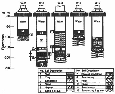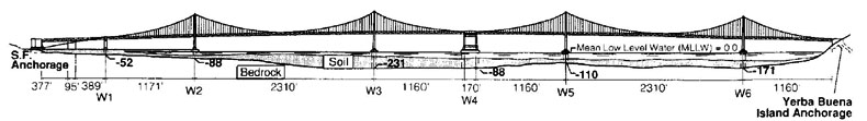The anchorages and Piers W1 through W6 are founded on Franciscan sandstone. Soil conditions at Piers W2 - W6 are shown in Fig. 2. Foundations at Piers W3 - W6 are cellular concrete caissons that were floated to the site, sunk through the overlying soil to rock, and then sealed with tremie concrete. These caissons extend as far as 231 ft (70 m) below water level and have footprints as large as 92 ft x 197 ft (28 m x 60 m). The caissons are lightly reinforced with low-deformation bars. Foundations at Piers W1 and W2 are spread footings on rock, built inside cofferdams. Piers A and B that support the continuous truss spans are founded on spread footings that bear on sand.