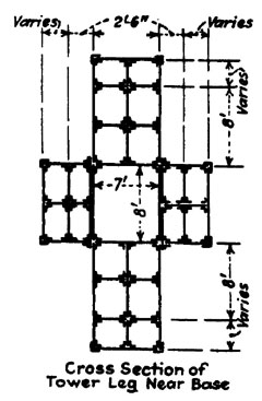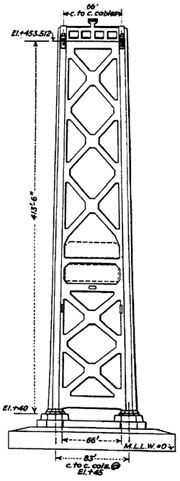 Batter-leg steel towers (Fig. 3) support the cables at W2, W3, W5, and W6. Riveted splices in the tower shafts were designed to develop the full compression capacity of the plates, but only partial tension capacity. The tower shafts are connected to the caisson caps with bolts anchored in steel grillages in the concrete. These bolts are not capable of developing the full bending capacity of the tower shafts. Additional support for the cables is provided by steel bents at W1 and the Yerba Buena anchorage. Cast steel cable saddles are bolted to the top of each tower and cable bent.