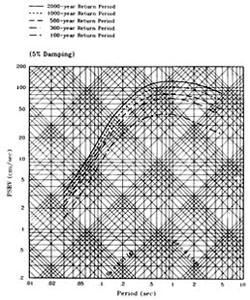 Response spectrum analyses were conducted for both the 300-year event and the maximum credible event, to establish an initial probabilistic estimate of seismic demands, to eliminate modeling problems prior to the time history analyses, and to establish the importance of various dynamic modes on seismic response. About 400 eigenvectors were required to excite the supporting components of the bridge and capture 90% of their mass; this number of vectors reached a shortest modal period of about 0.3 seconds.