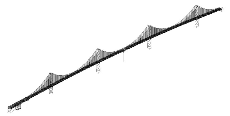 The global model represented the entire bridge from anchorage to anchorage, and was subjected to static and dynamic analyses to arrive at estimates of seismic demands and behavior of the bridge.