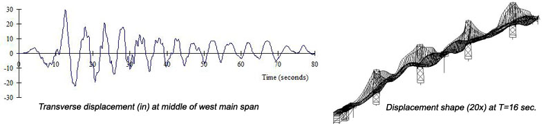 Eigenvectors and eigenvalues were extracted for use in response spectrum analyses and to gain an understanding of the dynamic behavior of the bridge. The calculated periods and mode shapes for several key modes are shown in Fig. 9. The long period of the fundamental mode, associated with transverse motion of the main span, is characteristic of suspension bridges. None of the modes shown causes significant motions in the towers or piers. These components are stiffer than the suspended system, and are excited by higher modes. The west suspension unit has marginally longer periods due to the long anchor spans of the cables at its west end.