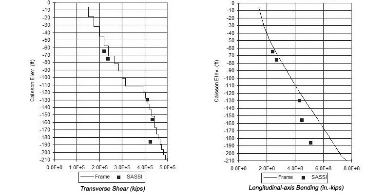 Response: Foundation response was evaluated by driving the SSI models with the rock motions and the interface forces from the superstructure. As a check, simpler models consisting of frame elements for the caissons, springs for the bedrock, dashpots for the soil, and lumped masses for the water were evaluated under the same conditions. The two models provided time-histories and envelopes of demands over the height of the caissons.