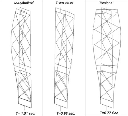 Vibration modes were extracted to determine how short a structural period is required to adequately capture mass participation of the tower. The first three vibration modes are illustrated in Fig. 14.