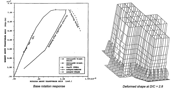 The model was pushed to a deformation d/c ratio of about 3.0 (Fig. 15); a sharp drop in moment was observed at a system d/c ratio of 2.9 (0.0115 radians rotation). The drop in capacity appears to be associated with buckling of the fins, especially those at the corners. The 1.9% strains in the anchor bolts are far from fracture even at peak deformation. Inelastic rivet behavior was not modeled; at a few critical locations, however, rivet demand exceeded capacity by a factor of two. Plastic strains caused a permanent-set deformation after unloading. At a d/c ratio of 2.0 (the highest value from the global analysis), about 24.5' of the base plate uplifts (¾ of the base length), and fairly limited plate buckling was observed.