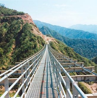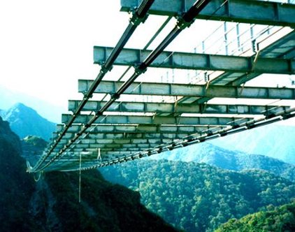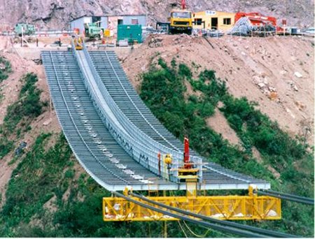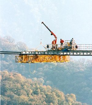 The construction program developed by OPAC consisted of casing mass concrete anchorages on the cliffs, securing these anchorages to the rock with post tensioned rock anchors, and then making the first aerial connection across the arroyo with a steel pilot cable. After installing and adjusting the final cables to their prescribed force and drape, the deck was erected using a crane and a movable platform suspended from the main cables. Framing components were delivered to the movable platform by a rail guided cart. Up to 9 segments were completed per day.