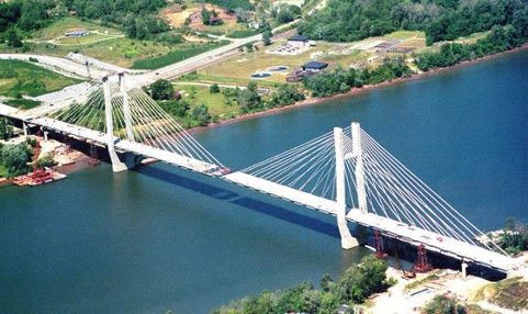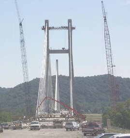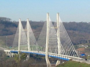 The Maysville (William H. Harsha) Bridge carries U.S. Highway 62/68 across the Ohio River between Maysville, Kentucky and Aberdeen, Ohio, about 50 miles southeast of Cincinnati, Ohio. The cable-stayed bridge has a main span of 1,050 ft and side spans of 525 ft. Each tower consists of battered reinforced concrete cellular shafts. The 60 ft wide deck consists of steel edge girders supporting a composite precast panel deck. The deck was erected by cantilevering from the towers, with prefabricated stay cables, field bolted edge girders, and precast deck panels.