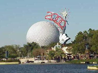 The Millennium Icon is a model of Mickey Mouse's gloved-hand, grasping a sorcerer's wand, extending 240 feet (73 meters) into the air and supporting a lighted "2000" sign on top of the golf ball-shaped Spaceship Earth. Mickey's gloved hand, the wand and the "2000" logo weighed nearly 50 tons. The steel frame that supported the icon weighed 250 tons. Each number in the "2000" logo was 36 feet tall. Those numbers are covered with more than 250,000 reflective eye-catchers.