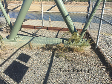 The tower is a V-shaped transverse frame and consists of steel pipes of various diameters. The cables are attached to the tower tops with pinned connections, so the cables act as tower guys. The towers are anchored to the ground by a pair of cross cables. The anchorage is of the gravity type and consists of a pier cap on top of tripod of three concrete shafts.