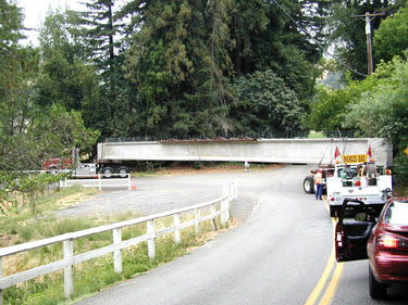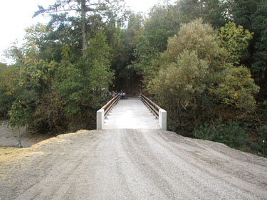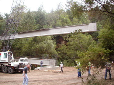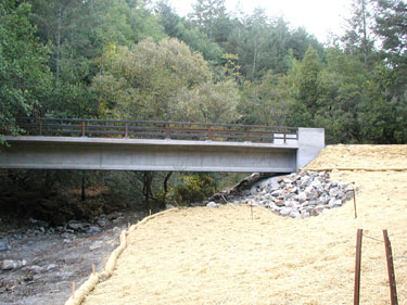 This privately-owned one-lane bridge at the Twin Valley Ranch in Sonoma County carries a new access road across Porter Creek to provide improved access to vineyards and the related processing facilities. In order to conform with the California Department of Fish and Game requirements, a clear span of 110 feet was established. This allowed for a streambed undisturbed during most of the construction and kept the abutments well clear of high water flows during the winter and spring seasons. The design consists of a simple span superstructure, concrete bridge posts integral with the abutments and tubular steel bridge rails for strength, durability and aesthetics. To save construction cost, the bridge is supported on spread footings which may slide laterally as much as 10 inches during a maximum credible earthquake. County standards required a minimum roadway width of 12 feet and HS20-44 live loads. OPAC was engaged by E. & J. Gallo Winery to design the bridge and provide engineering support during bidding and construction. Two preliminary design types were prepared, one a precast girder alternative and the other a composite steel girder alternative. Based on preliminary cost quotes from local contractors, the precast girder bridge was selected for final design.