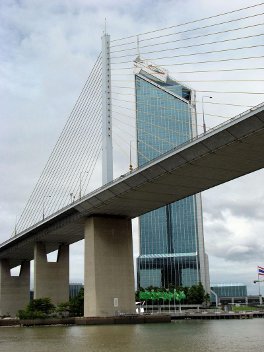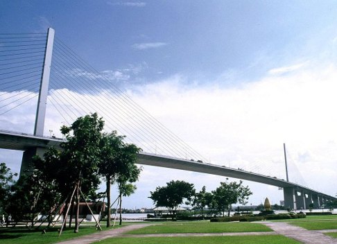 The Rama IX Bridge carries six lanes of expressway traffic across the Chao Phraya River in Bangkok, Thailand. The river crossing is a single-plane cable-stayed bridge with a 450-meter main span and two 166-meter side spans. Its steel box girder with orthotropic deck and steel pylons are supported on concrete piers and pile foundations. It was the second-longest cable-stayed span in the world when it was completed in 1987. To this day, it remains the longest span single-plane cable-stayed bridge in the world.