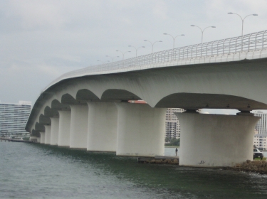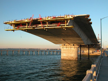 The Ringling Causeway Bridge is an eleven span precast concrete segmental box girder crossing of Sarasota Bay that was built alongside an older bridge that was subsequently demolished. The bridge structure is a multi-cell post tensioned concrete box girder with spans of about 184 feet to about 300 feet, supported by reinforced concrete piers and footings on drilled shafts. Superstructure erection was by balanced cantilever method with precast segments; pier segments and closures were cast in place. Two precast half-segments were used over the width of the single three-cell girder. The final girder section is symmetrical about its mid-width, but the individual half-segments are not.