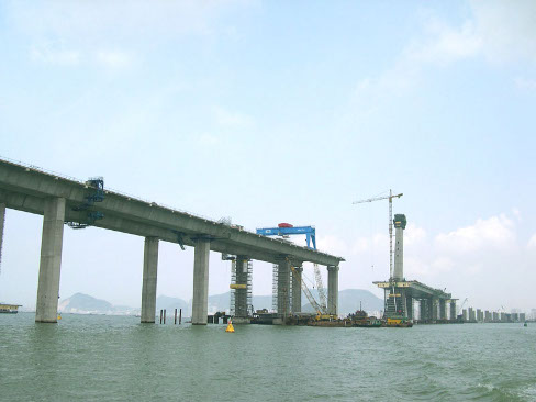 The Shenzhen Western Corridor Bridge is a 3.8 km long dual-carriageway 3-lane bridge connecting the Shenzhen portion of the Shenzhen Western Corridor at the Hong Kong SAR boundary with the Deep Bay Link at Ngau Hom Shek. The bridge consists of north approach spans, north navigation channel span, center connector spans, south navigation channel span and south approach spans. The channel spans are asymmetrical single-tower cable-stayed bridges with span length up to 210m. The approach spans and the connector spans are 75m span concrete box girders.