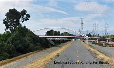 OPAC also prepared a 35% PS&E design for the Charleston Road Bridge which carries two lanes of traffic with shoulders as well as small utility conduits and a reclaimed water pipeline across the Stevens Creek and the levees at Charleston Road without permanent supports in the levees or creek. The main levee span is approximately 280 feet long and consists of a steel network arch with concrete edge girders and transverse floor beams.