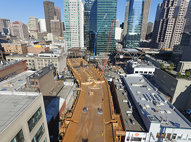 The Transbay Transit Center Bus Ramps in downtown San Francisco is an elevated bridge structure that will provide direct bus access from the Transbay Transit Center to the Bay Bridge as well as a future Bus Storage Facility.
