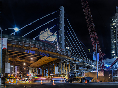 The bridge deck is consisted of two concrete box girders rigidly connected by a series of concrete link beams. The 120-ft high concrete tower and the end bent are monolithically connected to the deck. The tower is supported on two 200-ft deep slurry walls founded on bedrock. The designer for the Bus Ramps is Arup North America.
