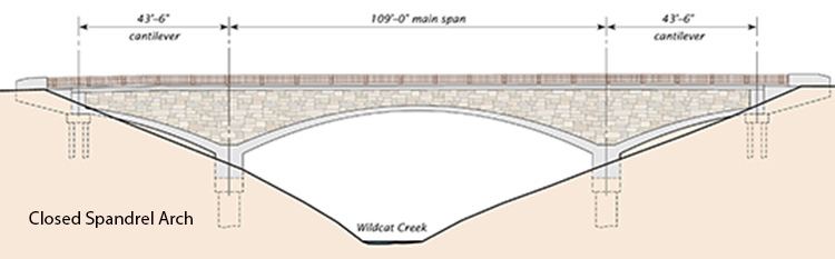 The new bridge will carry two 11-foot vehicular traffic lanes with 2-foot shoulders plus a 6-foot pedestrian sidewalk over Wildcat Creek. The alignment of the proposed bridge is nearly the same as that of the existing roadway. The profile grade will be at a constant slope between the approach roadway conform locations.