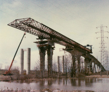 The dramatic failure of the Zilwaukee Bridge was successfully repaired by the State of Michigan in 1983. That same year, S.J. Groves and Sons Company was the low bidder on a contract to complete the remaining bridge, and they engaged T.Y. Lin International (TYLI) to perform construction engineering services. The contractor elected to continue the erection of the precast concrete segments by adapting the original method using the existing large and heavy erection truss and placing segments by the balanced cantilever method.