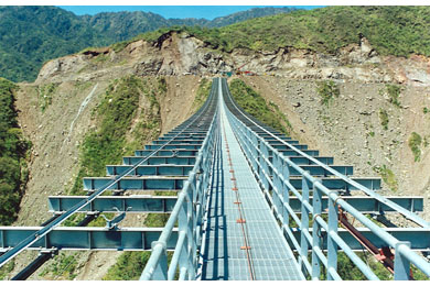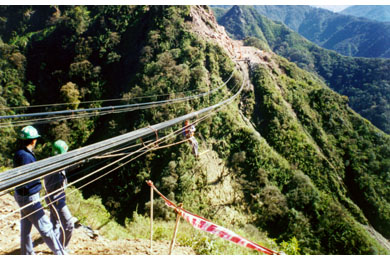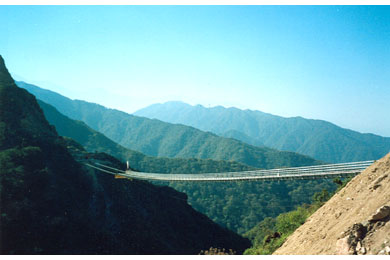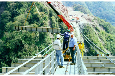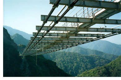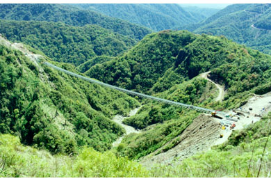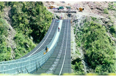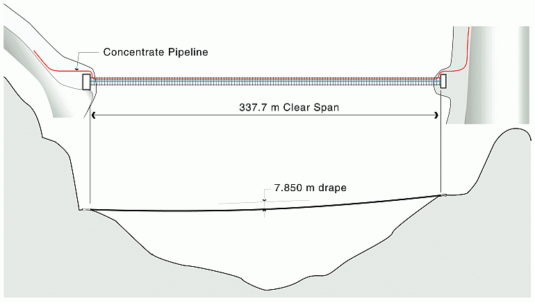 The 337 m single span bridge carries a 1 m wide foot path and 0.2 m diameter pipe across a rugged 90 m deep valley. It is an unstiffened suspension structure, with cables that support directly the open steel deck framing. The vertical alignment of its deck follows the drape of the cables, which sag 7.85 m (equivalent to 2.3% of the bridge length) at mid span.