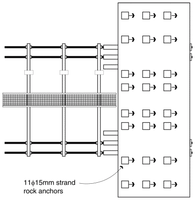 The abutments and rock anchors were designed to maintain a state of nominal compression in the rock under all service conditions. Changes in bridge cable forces under expected service loads were found to introduce large shears where the abutment bears on the rock. Therefore shear keys were provided in the rock, allowing the rock anchors to remain under a fairly constant stress.