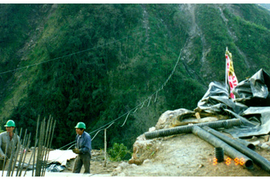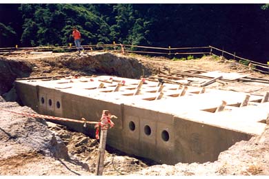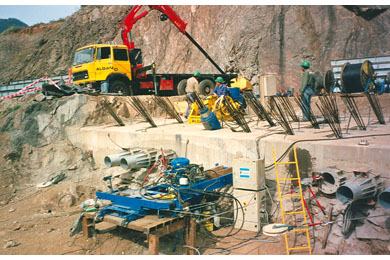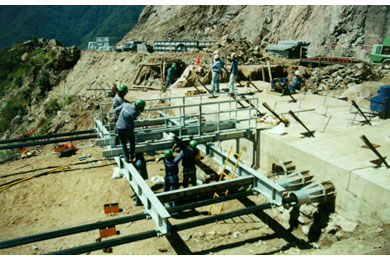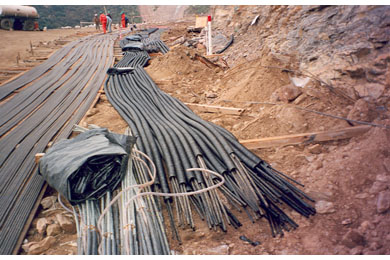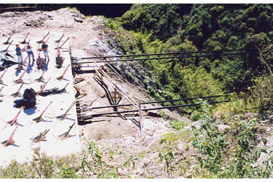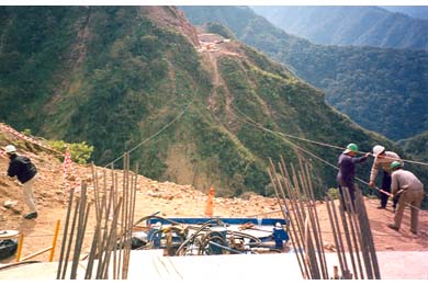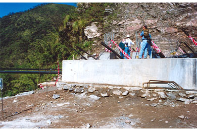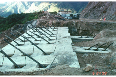 Construction of the abutments began in September 1997. Installation of the rock anchors was completed in July 1998 after several months of delays due to bad weather and the need to stabilize and clear the slopes of loose rock.