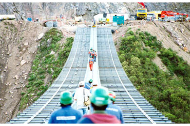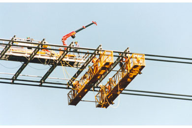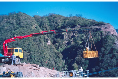 Once delivered to the working face of the steelwork by cart, the pieces were picked and hoisted into position with the deck-mounted crane, then bolted into place by workers on the movable platform. After the new segment was erected, the crane and platforms were moved along the cables and readied for the erection of the next segment. The cart was returned to Front 2 for another load while workers tightened bolts and advanced the crane and platform.