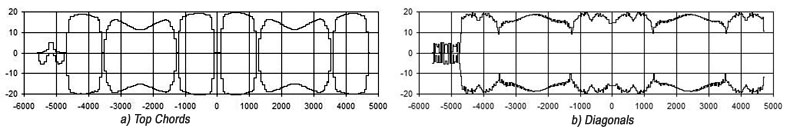 Live loads cause the dominant service load demands on the trusses, therefore static moving-load analyses were conducted to evaluate design live load demands on the truss members. In recognition of the conservatism of AASHTO lane loads for long span bridges [6], and in lieu of developing a site-specific live load model, the lane loadings specified by Caltrans for engineering studies of the Benicia-Martinez [7] and Carquinez parallel spans were used. A lane load of 0.54 kips/ft/lane was adopted, with no point loads for moment or shear, and no reduction for multiple lanes. This provided a total live load of 6.48 kips/ft to represent 12 lanes. Unfactored live load stress envelopes for truss top chords and diagonals are shown in Fig. 8. These envelopes indicate that design live load demands can utilize a significant portion of the truss member capacities.