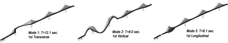 Eigenvectors and eigenvalues were extracted for use in response spectrum analyses and to gain an understanding of the dynamic behavior of the bridge. The calculated periods and mode shapes for several key modes are shown in Fig. 9. The long period of the fundamental mode, associated with transverse motion of the main span, is characteristic of suspension bridges. None of the modes shown causes significant motions in the towers or piers. These components are stiffer than the suspended system, and are excited by higher modes. The west suspension unit has marginally longer periods due to the long anchor spans of the cables at its west end.