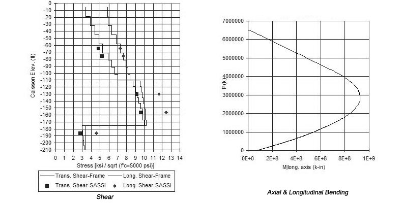 Response: Foundation response was evaluated by driving the SSI models with the rock motions and the interface forces from the superstructure. As a check, simpler models consisting of frame elements for the caissons, springs for the bedrock, dashpots for the soil, and lumped masses for the water were evaluated under the same conditions. The two models provided time-histories and envelopes of demands over the height of the caissons.