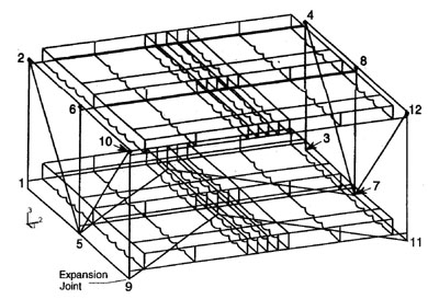 - Global participation of the deck slabs was considered using frame elements, representing the gross stiffness of the floor slab / stringer system, connected to the center nodes of the floor beams. This model was calibrated against the results of a detailed local truss model described subsequently. The deck slab joints at every fourth floor beam were considered using conventional tension and compression models. Explicit modeling of pounding of these joints was outside the scope of the project.