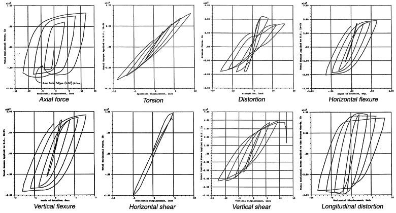 Inelastic deformation characteristics, vulnerabilities, and ductility capacities of the trusses were investigated by subjecting this model to axial, torsion, distortion, horizontal flexure, vertical flexure, horizontal shear, vertical shear, and longitudinal distortion deformation patterns. For each deformation pattern, monotonic loadings provided estimates of the displacements at unit ductility, while cyclic loadings provided estimates of the ductility capacities in each deformation mode. Cyclic behavior is illustrated in Fig. 17 and discussed below.