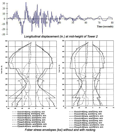 Linear multi-support ground motion analyses were conducted to evaluate the effects of the time-delayed incoherent ground motions. These motions changed significantly the peak response of some critical components such as the truss chords and the tower bases, due to the additional structural modes that they excite and the change in phasing of various responses. These analyses also provided a reliable indication of the locations of significant nonlinearities in seismic response.