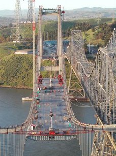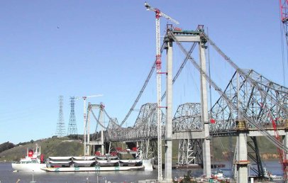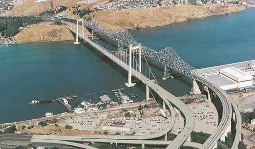The Third Carquinez Strait (Al Zampa Memorial) Bridge carries Interstate Highway 80 across the Sacramento River, replacing a structurally deficient truss bridge that was built in 1927. The suspension bridge has a main span of 728 meters, drilled shaft foundations in the river, reinforced concrete towers, and an aerodynamically streamlined steel orthotropic deck. It was the longest span new bridge in the United States in over 35 years when it was completed.