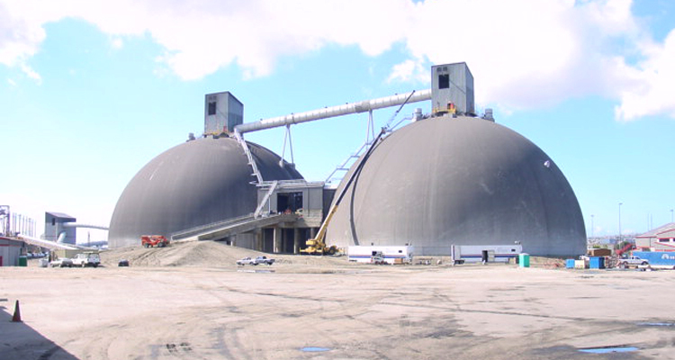 Los Angeles Export Terminal, San Pedro, California, consists of two 75,000 ton capacity petroleum coke storage domes. Each dome is 240 feet in diameter and 130 feet high. The common reclaim tunnel beneath the domes is over 630 feet long and contains the loadout conveyor which transfers the petroleum coke from each of the storage domes to the ship loading system. Both dome foundations and the reclaim tunnel penetrate and are sealed to an existing dual layer membrane which maintains an environmental seal throughout the site. Reclaim from the storage domes is done using vibratory reclaim cones, which deposit the product onto the common reclaim conveyor under the domes. A common entry ramp between the domes allows for end loader and maintenance access. Personnel access to the top of the domes is via the fill conveyor system or the elevated ramp and escape stairs between the domes.