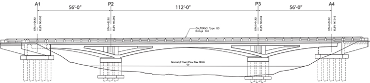 The replacement bridge is roughly parallel to and downstream of the existing truss. It has two 11-foot lanes with two 3-foot shoulders for a clear width between curbs of 28 feet. The bridge structure is a prestressed concrete open spandrel arch with a main span of 112 feet and end spans of 56 feet each.