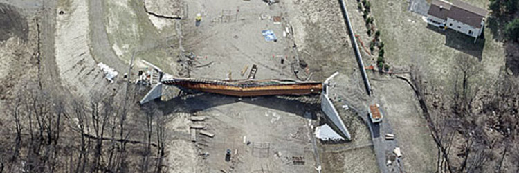 On October 12, 2002, a pedestrian bridge being constructed over the Utica-Rome Expressway in the Town of Marcy, Oneida County collapsed and killed one worker and injured nine others. The collapse occurred when all the reinforcement, forms, construction equipment and workers were on the deck, and the concrete deck was being placed. The collapsed bridge consisted of a single span of approximately 170 ft long with a composite cross section of steel tub girder and cast-in-place concrete deck. After the accident occurred, the New York State Department of Transportation commissioned an independent investigation into the cause of the collapse. Legal dispute took place soon after.