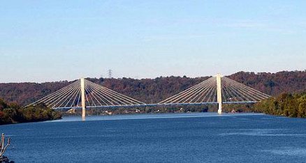 The Maysville (William H. Harsha) Bridge carries U.S. Highway 62/68 across the Ohio River between Maysville, Kentucky and Aberdeen, Ohio, about 50 miles southeast of Cincinnati, Ohio. The cable-stayed bridge has a main span of 1,050 ft and side spans of 525 ft. Each tower consists of battered reinforced concrete cellular shafts. The 60 ft wide deck consists of steel edge girders supporting a composite precast panel deck. The deck was erected by cantilevering from the towers, with prefabricated stay cables, field bolted edge girders, and precast deck panels.