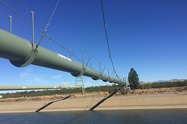 The existing L-400 Bridge is a suspension bridge consists of one continuous 36-inch pipe supported by two V-Frame towers, one on the North side of the canal and one on the South side of the canal. The pipe carries natural gas at approximately 900 psi. The pipe is held in place with cables and suspenders. The bridge has a main span of 246 feet with a main cable length of 250 feet.