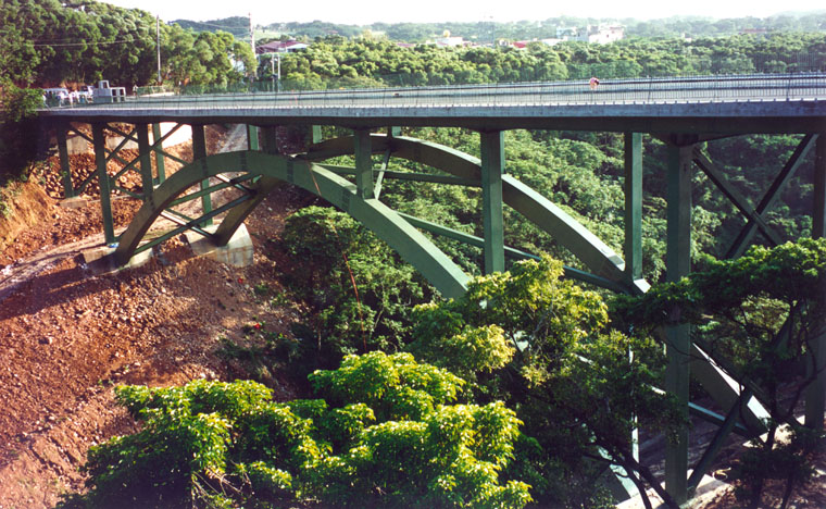 The Ping Ding Steel Arch Bridge provides access to a private housing development and community center in the suburbs of Taipei, Taiwan. It carries two lanes of vehicular traffic and sidewalks. It was designed by OPAC to provide an economical, aesthetic, and rapidly built bridge to provide construction- and permanent- access across a deep ravine.