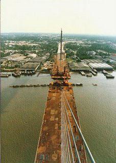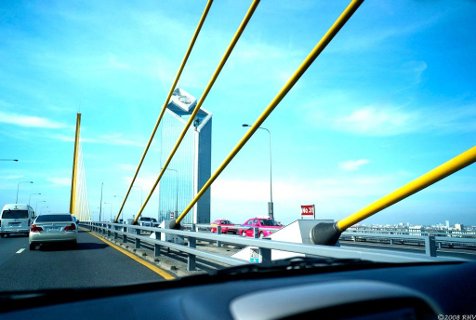 The Rama IX Bridge carries six lanes of expressway traffic across the Chao Phraya River in Bangkok, Thailand. The river crossing is a single-plane cable-stayed bridge with a 450-meter main span and two 166-meter side spans. Its steel box girder with orthotropic deck and steel pylons are supported on concrete piers and pile foundations. It was the second-longest cable-stayed span in the world when it was completed in 1987. To this day, it remains the longest span single-plane cable-stayed bridge in the world.