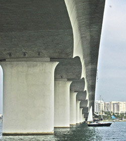 The Ringling Causeway Bridge is an eleven span precast concrete segmental box girder crossing of Sarasota Bay that was built alongside an older bridge that was subsequently demolished. The bridge structure is a multi-cell post tensioned concrete box girder with spans of about 184 feet to about 300 feet, supported by reinforced concrete piers and footings on drilled shafts. Superstructure erection was by balanced cantilever method with precast segments; pier segments and closures were cast in place. Two precast half-segments were used over the width of the single three-cell girder. The final girder section is symmetrical about its mid-width, but the individual half-segments are not.