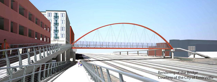 The South Bayfront Pedestrian Bridge project involves the design and construction of a pedestrian-bicycle bridge which will connect to the Emeryville Greenway on the east side and will provide a path across the railroad tracks to connect to the Bay Trail to the west. It will also provide convenient access from central Emeryville to the Bay Street Center. The project includes the ramps and connections from the bridge to existing or proposed projects. On the west side, it will connect to Ohlone Way and the Bay Street parking garage. On the east side, it connects to the future Horton Landing Park.