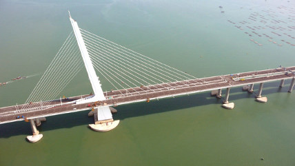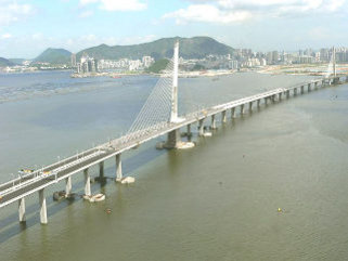 The Shenzhen Western Corridor Bridge is a 3.8 km long dual-carriageway 3-lane bridge connecting the Shenzhen portion of the Shenzhen Western Corridor at the Hong Kong SAR boundary with the Deep Bay Link at Ngau Hom Shek. The bridge consists of north approach spans, north navigation channel span, center connector spans, south navigation channel span and south approach spans. The channel spans are asymmetrical single-tower cable-stayed bridges with span length up to 210m. The approach spans and the connector spans are 75m span concrete box girders.