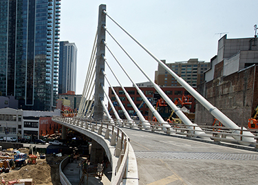 The cable-stayed bridge, as part of the Bus Ramp Viaduct, is a single-tower structure with single plane of cables along the centerline of the bridge deck. The main span consists of a 140-ft cantilever span over a park above the future underground train station and a 60-ft drop-in span over a local street. The side span is 120-ft long over Howard Street.